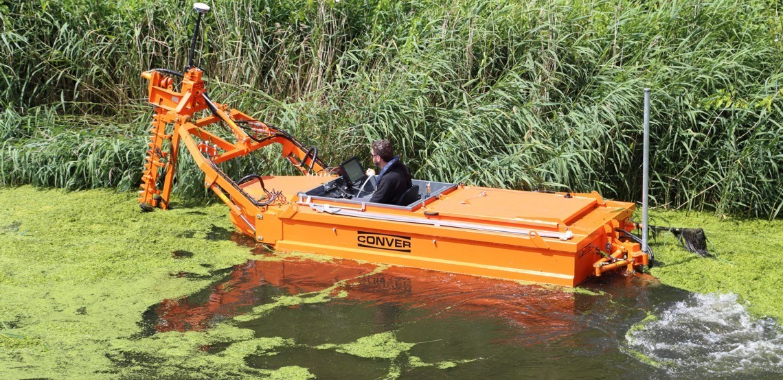 In the water a Conver weed boat fitted with front T-cutter unit for cutting river bed vegetation. This particular boat was fitted with a GPS tracking system which accurately plotted the boats passes onto a screen allowing the operator a visual record of movements.